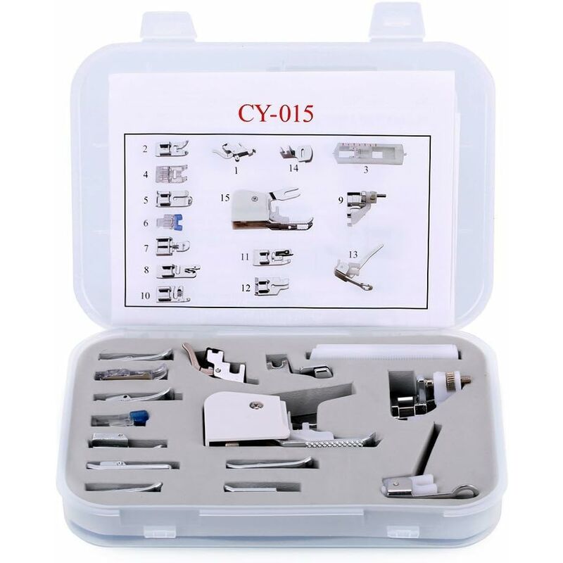 240,4 grammi Materiale: Lega di zinco Peso articolo: 240 g Disponibilità parti di ricambio: Informazioni parti di ricambio non disponibili Questi piedini hanno un fissaggio universale per la maggior parte delle macchine a montaggio basso, ma potrebbe non essere adatto per macchine industriali, vintage e mini. Suggerimenti: c'è un'immagine sul retro della confezione per mostrare il nome inglese di ciascuno dei piedi. Caratteristiche: - Materiale: lega di zinco, PVC. - Quantità: 15 pezzi. - Colore: argento. - Dimensioni: 20 x 9,5 x 2,5 cm. - Peso netto: 200 g. Informazioni sul contenuto: 1- Stelo a sgancio rapido, adattatore per stelo basso. 2- Piedino multiuso a zig zag. 3- Piedino per asole. 4- Piedino in raso satinato con punto pieno. 5- Piedino punto diritto. Piedino a 6 bottoni. 7- Piedino per cerniere. 8- Piedino per orlare/arrotolare 3 mm. 9- Piedino per punto