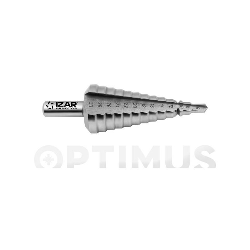 Nuova robusta punta autocentrante. Speciale svasatura a 45°. Minore usura e sforzo di taglio. Maggiori prestazioni e durata dell'utensile. Migliore evacuazione dei trucioli. Finitura senza bave. Speciale per plastiche e acciai. 13 fasi: 6-8-10-12-14-16-18-20-22-24-26-28-30