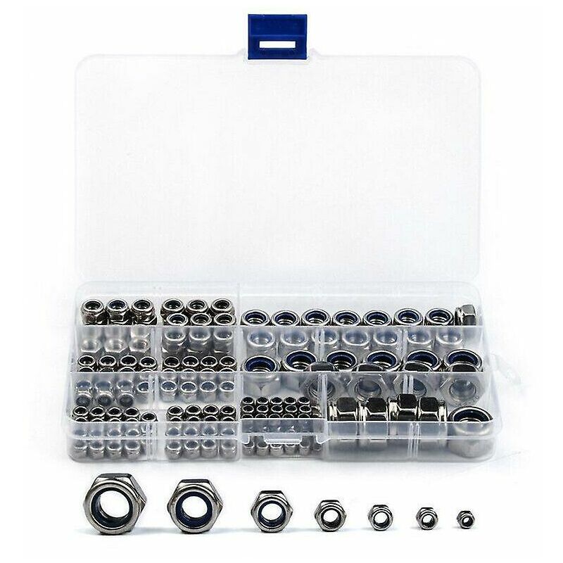 Assortimento di dadi in 7 misure: la confezione contiene 165 pezzi di dadi freno in 7 misure opzionali, tra cui 45 x m3, 35 x m4, 30 x m5, 30 x m6, 15 x m8, 10 x m10, 5 x m12, la combinazione valida è sufficiente per soddisfare le diverse esigenze. Materiale di alta qualità: questi dadi esagonali sono realizzati in acciaio inossidabile 304, robusti, durevoli, resistenti alla ruggine, alla corrosione e all'ossidazione, non facili da deviare, puoi usarli con sicurezza. Eccellente tenuta: questi controdadi sono conformi al sistema metrico standard, quindi saranno conformi alla maggior parte dei bulloni o delle viti. La filettatura precisa assicura che il dado blocchi saldamente il mandrino anche in caso di vibrazioni. Facile da ordinare: questi dadi autobloccanti sono ordinatamente conservati in una scatola di immagazzinaggio trasparente, quindi non ti preoccuperai di smistare. Inoltre, la scatola di immagazzinaggio ti offre una soluzione perfetta per conservare le noci. AMPIA