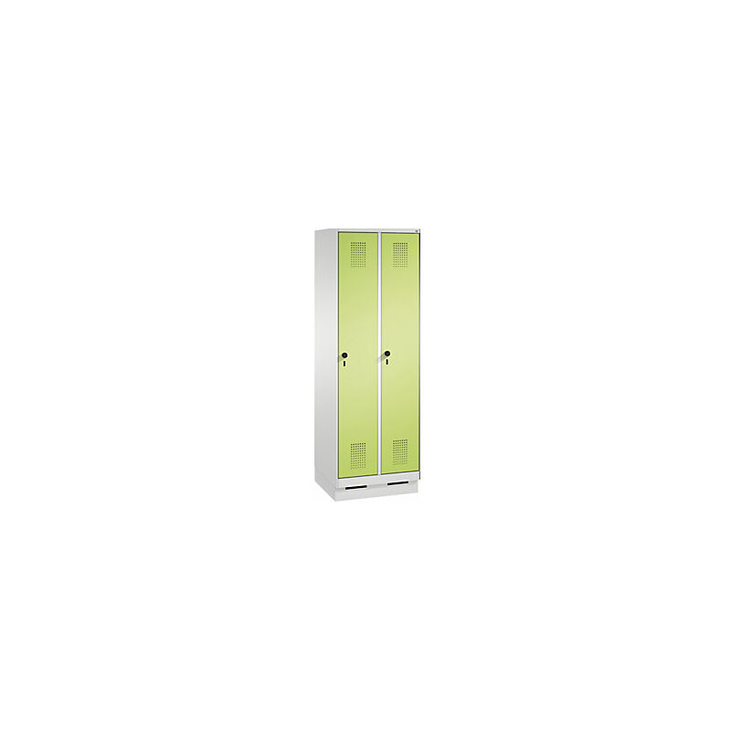 Armadietto guardaroba EVOLO, con zoccolino, 2 vani, larghezza vani 300 mm, grigio chiaro / verdino. Fornitura = montato. Altezza = 1800 mm. Profondità = 500 mm. Larghezza = 600 mm. Colore corpo = grigio chiaro RAL 7035. Colore porta = verde azzurrognolo RDS 1108060. Serratura = chiavistello girevole di sicurezza per lucchetto. Numero scomparti in larghezza = 2 pz. Numero scomparti = 2 pz. Larghezza scomparti = 300 mm. Materiale = lamiera d'acciaio. Altezza armadietto = 1800 mm. Dotazione interna = 1 ripiano, 1 asta appendiabiti con 3 ganci scorrevoli. Larghezza interna = 245 mm. Altezza interna = 1600 mm. Profondità interna = 465 mm. Tipo di porta = ante con fessure di ventilazione. Altezza scomparti = 1800 mm. Larghezza ripiani = 300 mm. Profondità ripiani = 500 mm. Altezza zoccolo = 100 mm. Struttura = con saldatura. Superficie = con verniciatura a forno. All'interno di ogni vano 1 piano d'appoggio, 1 robusta asta appendiabiti a sezione ovale con 3 ganci scorrevoli antitorsione. Su