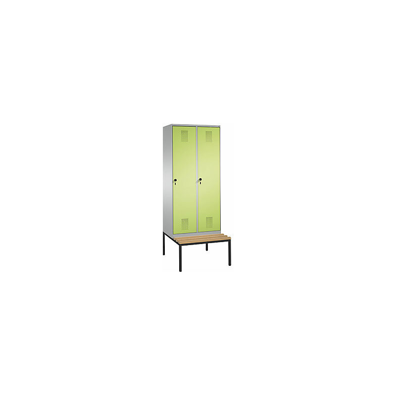Armadietto guardaroba EVOLO, con panca, 2 vani, larghezza vani 400 mm, alluminio brillante / verdino. Fornitura = montato. Altezza = 2090 mm. Larghezza = 800 mm. Profondità = 815 mm. Colore corpo = alluminio brillante RAL 9006. Colore porta = verde azzurrognolo RDS 1108060. Serratura = chiavistello girevole di sicurezza per lucchetto. Numero scomparti in larghezza = 2 pz. Materiale = lamiera d'acciaio. Larghezza scomparti = 400 mm. Profondità scomparti = 500 mm. Dotazione interna = 1 ripiano, 1 asta appendiabiti con 3 ganci scorrevoli. Altezza sedile = 420 mm. Profondità sedile = 315 mm. Profondità armadio = 500 mm. Tipo di porta = ante piene. Colore doghe = faggio. Colore telaio = nero. Versione = con panca integrata. Serie = EVOLO. Larghezza interna = 345 mm. Altezza interna = 1600 mm. All'interno di ogni vano 1 piano d'appoggio, 1 robusta asta appendiabiti a sezione ovale con 3 ganci scorrevoli antitorsione. Panca integrata con piedini regolabili per la semplice messa in piano fino