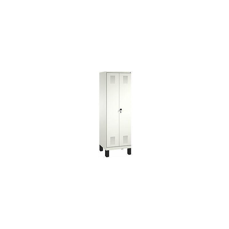 Armadietto guardaroba e per biancheria EVOLO, 4 ripiani, asta appendiabiti, 2 vani di 300 mm, con piedini, bianco traffico / bianco traffico. Fornitura = montato. Altezza = 1850 mm. Profondità = 500 mm. Larghezza = 600 mm. Colore corpo = bianco traffico RAL 9016. Colore porta = bianco traffico RAL 9016. Serratura = chiavistello girevole di sicurezza per lucchetto. Numero scomparti in larghezza = 1 pz. Numero scomparti = 5 pz. Larghezza scomparti = 300 mm. Materiale = lamiera d'acciaio. Altezza armadietto = 1850 mm. Dotazione interna = 4 ripiani fissi a sinistra, guardaroba con cappelliera e asta appendiabiti a destra. Larghezza interna = 245 mm. Altezza interna = 1600 mm. Profondità interna = 465 mm. Tipo di porta = ante con fessure di ventilazione. Larghezza ripiani = 300 mm. Profondità ripiani = 500 mm. Altezza piedini = 150 mm. Struttura = con saldatura. Superficie = con verniciatura a forno. Con parete divisoria centrale, a sinistri 4 ripiani fissi, a destra piano d'appoggio e
