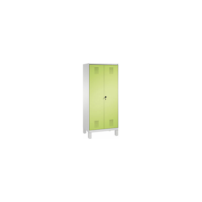 Armadietto guardaroba e per biancheria EVOLO, 4 ripiani, asta appendiabiti, 2 vani di 400 mm, con piedini, grigio chiaro / verdino. Fornitura = montato. Altezza = 1850 mm. Profondità = 500 mm. Larghezza = 800 mm. Colore corpo = grigio chiaro RAL 7035. Colore porta = verde azzurrognolo RDS 1108060. Serratura = chiavistello girevole di sicurezza per lucchetto. Numero scomparti in larghezza = 1 pz. Numero scomparti = 5 pz. Larghezza scomparti = 400 mm. Materiale = lamiera d'acciaio. Altezza armadietto = 1850 mm. Dotazione interna = 4 ripiani fissi a sinistra, guardaroba con cappelliera e asta appendiabiti a destra. Larghezza interna = 345 mm. Altezza interna = 1600 mm. Profondità interna = 465 mm. Tipo di porta = ante con fessure di ventilazione. Larghezza ripiani = 400 mm. Profondità ripiani = 500 mm. Altezza piedini = 150 mm. Struttura = con saldatura. Superficie = con verniciatura a forno. Con parete divisoria centrale, a sinistri 4 ripiani fissi, a destra piano d'appoggio e
