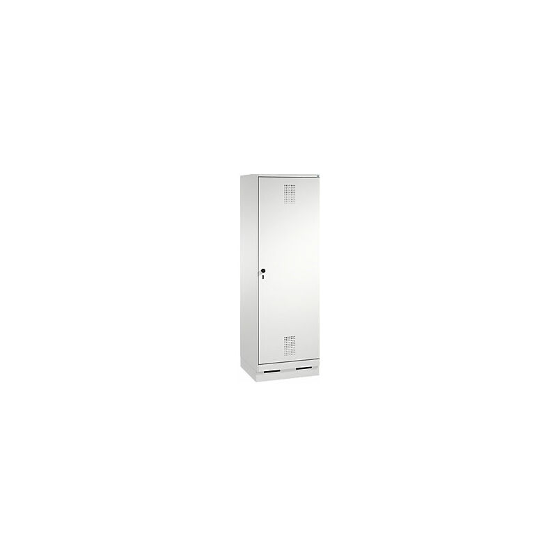 Armadietto guardaroba EVOLO, anta sopra 2 vani, con zoccolino, 2 vani, 1 anta, larghezza vani 300 mm, grigio chiaro. Fornitura = montato. Altezza = 1800 mm. Profondità = 500 mm. Larghezza = 600 mm. Colore corpo = grigio chiaro RAL 7035. Colore porta = grigio chiaro RAL 7035. Serratura = chiavistello girevole di sicurezza per lucchetto. Numero scomparti in larghezza = 2 pz. Numero scomparti = 2 pz. Larghezza scomparti = 300 mm. Materiale = lamiera d'acciaio. Altezza armadietto = 1800 mm. Dotazione interna = 1 ripiano, 1 asta appendiabiti con 3 ganci scorrevoli. Profondità interna = 465 mm. Tipo di porta = 1 anta a battente. Altezza zoccolo = 100 mm. Struttura = con saldatura. Superficie = con verniciatura a forno. 1 anta sopra 2 vani, battuta a destra, supporto su perni. All'interno 1 piano d'appoggio per vano, 1 robusta asta appendiabiti a sezione ovale con 3 ganci scorrevoli antitorsione. Su zoccolino alto 100 mm, arretrato anteriormente. Chiavistello girevole di sicurezza per