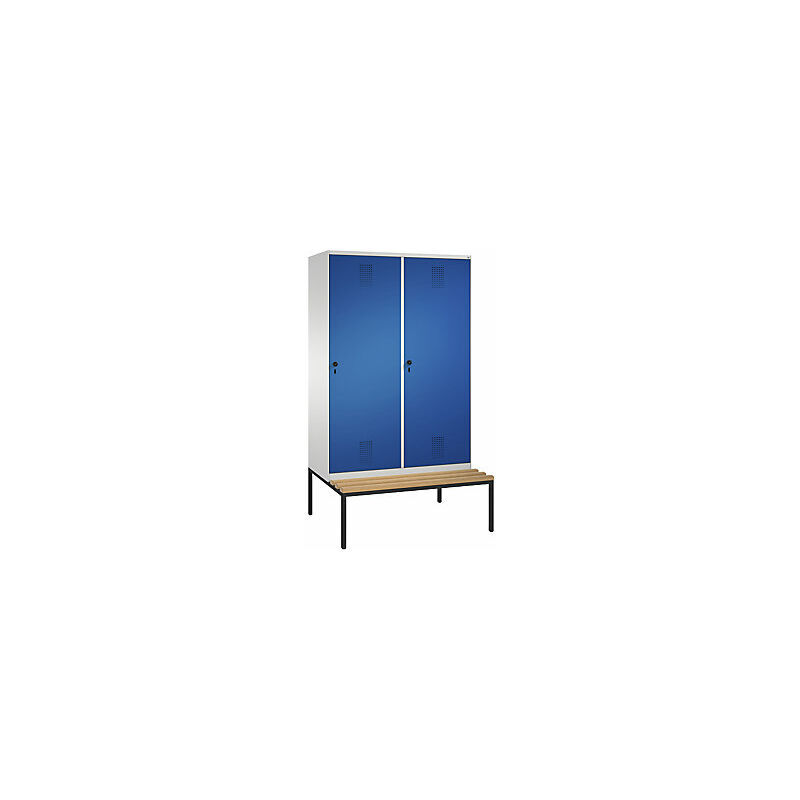 Armadietto guardaroba EVOLO, con panca, anta sopra 2 vani, 4 vani, 2 ante, larghezza vani 300 mm, grigio chiaro / blu genziana. Fornitura = montato. Altezza = 2090 mm. Larghezza = 1200 mm. Profondità = 815 mm. Colore corpo = grigio chiaro RAL 7035. Colore porta = blu genziana RAL 5010. Serratura = chiavistello girevole di sicurezza per lucchetto. Numero scomparti in larghezza = 4 pz. Materiale = lamiera d'acciaio. Larghezza scomparti = 300 mm. Profondità scomparti = 500 mm. Dotazione interna = 1 cappelliera, 1 asta appendiabiti con 3 ganci, 1 parete divisoria centrale. Altezza sedile = 420 mm. Profondità sedile = 315 mm. Profondità armadio = 500 mm. Tipo di porta = ante piene. Colore doghe = faggio. Colore telaio = nero. Versione = con panca integrata. Serie = EVOLO. Larghezza interna = 245 mm. Altezza interna = 1600 mm. 1 anta sopra 2 vani, battuta a destra, supporto su perni. All'interno 1 piano d'appoggio per vano, 1 robusta asta appendiabiti a sezione ovale con 3 ganci scorrevoli