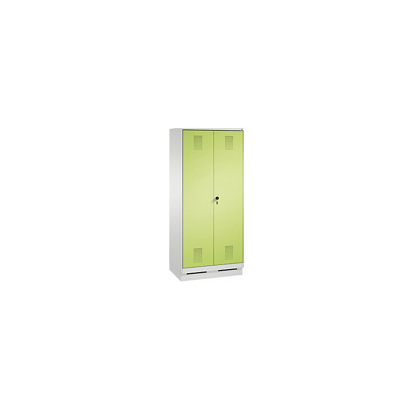 Armadio di magazzinaggio EVOLO, ante battenti, con zoccolino, 2 vani, larghezza vani 400 mm, con 8 ripiani, grigio chiaro / verdino. Fornitura = montato. Altezza = 1800 mm. Profondità = 500 mm. Larghezza = 800 mm. Colore corpo = grigio chiaro RAL 7035. Colore porta = verde azzurrognolo RDS 1108060. Serratura = chiavistello girevole di sicurezza per lucchetto. Numero scomparti in larghezza = 2 pz. Numero scomparti = 10 pz. Larghezza scomparti = 400 mm. Materiale = lamiera d'acciaio. Altezza armadietto = 1800 mm. Dotazione interna = parete divisoria e 2x4 ripiani. Larghezza interna = 2x345 mm. Profondità interna = 465 mm. Tipo di porta = 2 ante a battente. Larghezza ripiani = 345 mm. Profondità ripiani = 500 mm. Altezza zoccolo = 100 mm. Struttura = con saldatura. Superficie = con verniciatura a forno. Con parete divisoria centrale, 2 ante battenti con serratura unica, supporto su perni, all'interno 4 piani d'appoggio per vano, su zoccolino alto 100 mm. Chiavistello girevole di sicurezza