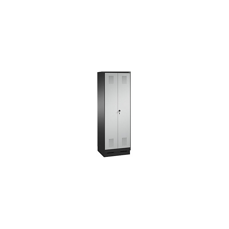 Armadietto guardaroba e per biancheria EVOLO, 4 ripiani, asta appendiabiti, 2 vani di 300 mm, con zoccolino, grigio nerastro / alluminio brillante. Fornitura = montato. Altezza = 1800 mm. Profondità = 500 mm. Larghezza = 600 mm. Colore corpo = grigio nerastro RAL 7021. Colore porta = alluminio brillante RAL 9006. Serratura = chiavistello girevole di sicurezza per lucchetto. Numero scomparti in larghezza = 1 pz. Numero scomparti = 5 pz. Larghezza scomparti = 300 mm. Materiale = lamiera d'acciaio. Altezza armadietto = 1800 mm. Dotazione interna = 4 ripiani fissi a sinistra, guardaroba con cappelliera e asta appendiabiti a destra. Larghezza interna = 245 mm. Altezza interna = 1600 mm. Profondità interna = 465 mm. Tipo di porta = ante con fessure di ventilazione. Larghezza ripiani = 300 mm. Profondità ripiani = 500 mm. Altezza zoccolo = 100 mm. Struttura = con saldatura. Superficie = con verniciatura a forno. Con parete divisoria centrale, a sinistri 4 ripiani fissi, a destra piano