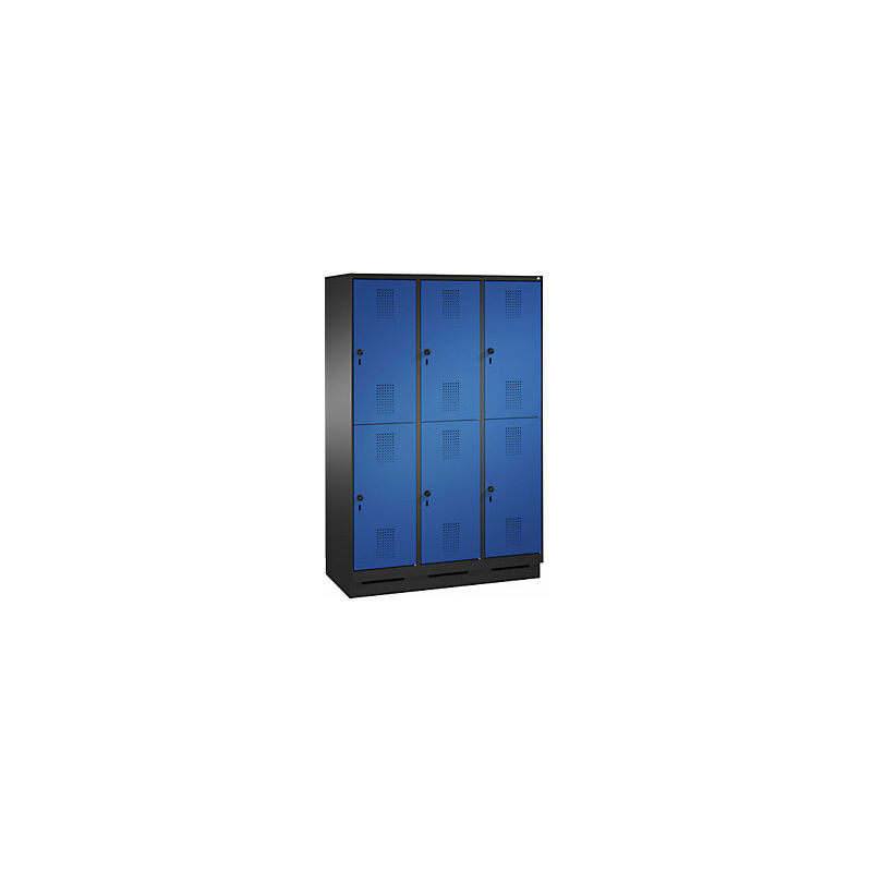 Armadietto guardaroba EVOLO, a due piani, con zoccolino, 3 vani, 2 scomparti per vano, larghezza vani 400 mm, grigio nerastro / blu genziana. Fornitura = montato. Altezza = 1800 mm. Profondità = 500 mm. Larghezza = 1200 mm. Colore corpo = grigio nerastro RAL 7021. Colore porta = blu genziana RAL 5010. Serratura = chiavistello girevole di sicurezza per lucchetto. Numero scomparti in larghezza = 3 pz. Numero scomparti = 6 pz. Larghezza scomparti = 400 mm. Materiale = lamiera d'acciaio. Altezza armadietto = 1800 mm. Dotazione interna = 1 asta appendiabiti, 3 ganci scorrevoli. Larghezza interna = 345 mm. Altezza interna = 813 mm. Profondità interna = 465 mm. Tipo di porta = ante con fessure di ventilazione. Altezza scomparti = 813 mm. Larghezza ripiani = 400 mm. Profondità ripiani = 500 mm. Altezza zoccolo = 100 mm. Struttura = con saldatura. Superficie = con verniciatura a forno. Lo scomparto è dotato di 1 robusta asta appendiabiti a sezione ovale con 3 ganci scorrevoli antitorsione.