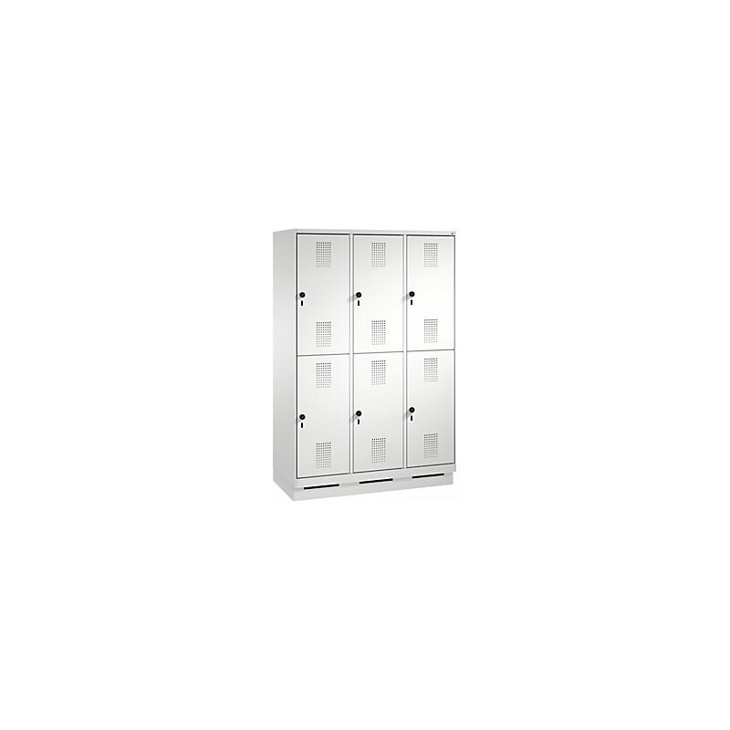 Armadietto guardaroba EVOLO, a due piani, con zoccolino, 3 vani, 2 scomparti per vano, larghezza vani 400 mm, grigio chiaro. Fornitura = montato. Altezza = 1800 mm. Profondità = 500 mm. Larghezza = 1200 mm. Colore corpo = grigio chiaro RAL 7035. Colore porta = grigio chiaro RAL 7035. Serratura = chiavistello girevole di sicurezza per lucchetto. Numero scomparti in larghezza = 3 pz. Numero scomparti = 6 pz. Larghezza scomparti = 400 mm. Materiale = lamiera d'acciaio. Altezza armadietto = 1800 mm. Dotazione interna = 1 asta appendiabiti, 3 ganci scorrevoli. Larghezza interna = 345 mm. Altezza interna = 813 mm. Profondità interna = 465 mm. Tipo di porta = ante con fessure di ventilazione. Altezza scomparti = 813 mm. Larghezza ripiani = 400 mm. Profondità ripiani = 500 mm. Altezza zoccolo = 100 mm. Struttura = con saldatura. Superficie = con verniciatura a forno. Lo scomparto è dotato di 1 robusta asta appendiabiti a sezione ovale con 3 ganci scorrevoli antitorsione. Zoccolino alto 100 mm