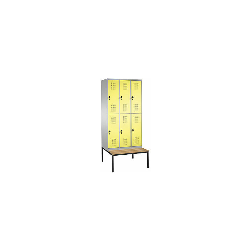 Armadietto guardaroba EVOLO, a due piani, con panca, 3 vani, 2 scomparti per vano, larghezza vani 300 mm, alluminio brillante / giallo zolfo. Fornitura = preassemblato, montaggio finale a cura del cliente. Altezza = 2090 mm. Larghezza = 900 mm. Profondità = 815 mm. Colore corpo = alluminio brillante RAL 9006. Colore porta = giallo zolfo RDS 0959059. Serratura = chiavistello girevole di sicurezza per lucchetto. Numero scomparti in larghezza = 3 pz. Numero scomparti = 6 pz. Materiale = lamiera d'acciaio. Larghezza scomparti = 300 mm. Profondità scomparti = 500 mm. Dotazione interna = 1 asta appendiabiti, 3 ganci scorrevoli. Altezza sedile = 420 mm. Profondità sedile = 315 mm. Profondità armadio = 500 mm. Tipo di porta = ante piene. Colore doghe = faggio. Colore telaio = nero. Versione = con panca integrata. Serie = EVOLO. Larghezza interna = 245 mm. Altezza interna = 813 mm. Lo scomparto è dotato di una robusta asta appendiabiti a sezione ovale con 3 ganci scorrevoli antitorsione. Panca