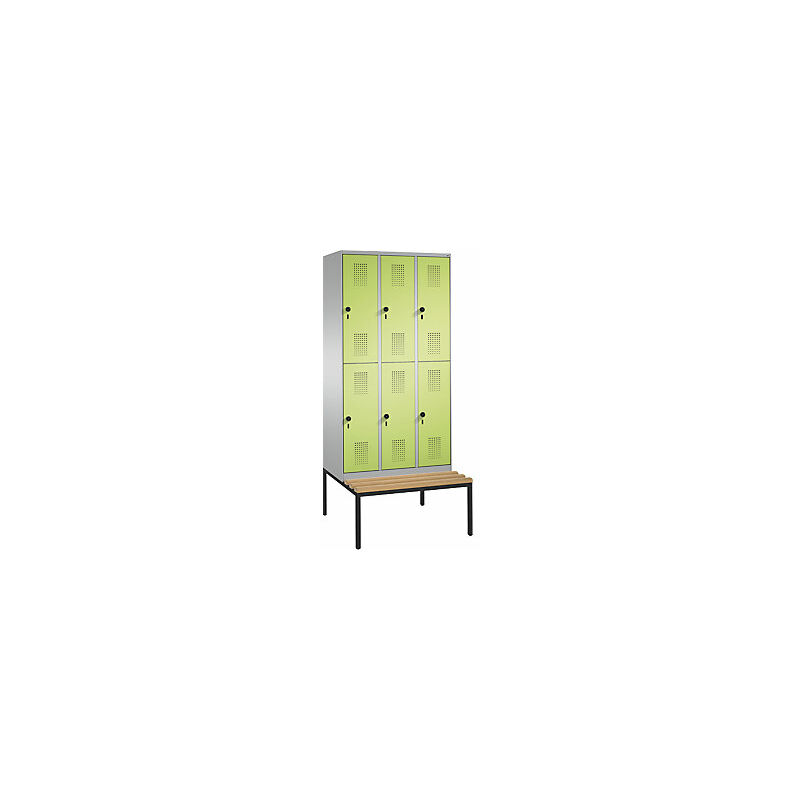 Armadietto guardaroba EVOLO, a due piani, con panca, 3 vani, 2 scomparti per vano, larghezza vani 300 mm, alluminio brillante / verdino. Fornitura = preassemblato, montaggio finale a cura del cliente. Altezza = 2090 mm. Larghezza = 900 mm. Profondità = 815 mm. Colore corpo = alluminio brillante RAL 9006. Colore porta = verde azzurrognolo RDS 1108060. Serratura = chiavistello girevole di sicurezza per lucchetto. Numero scomparti in larghezza = 3 pz. Numero scomparti = 6 pz. Materiale = lamiera d'acciaio. Larghezza scomparti = 300 mm. Profondità scomparti = 500 mm. Dotazione interna = 1 asta appendiabiti, 3 ganci scorrevoli. Altezza sedile = 420 mm. Profondità sedile = 315 mm. Profondità armadio = 500 mm. Tipo di porta = ante piene. Colore doghe = faggio. Colore telaio = nero. Versione = con panca integrata. Serie = EVOLO. Larghezza interna = 245 mm. Altezza interna = 813 mm. Lo scomparto è dotato di una robusta asta appendiabiti a sezione ovale con 3 ganci scorrevoli antitorsione. Panca