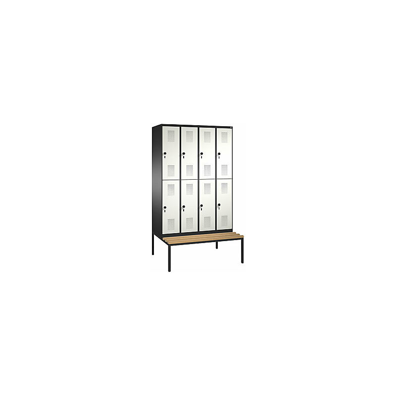 Armadietto guardaroba EVOLO, a due piani, con panca, 4 vani, 2 scomparti per vano, larghezza vani 300 mm, grigio nerastro / bianco puro. Fornitura = preassemblato, montaggio finale a cura del cliente. Altezza = 2090 mm. Larghezza = 1200 mm. Profondità = 815 mm. Colore corpo = grigio nerastro RAL 7021. Colore porta = bianco puro RAL 9010. Serratura = chiavistello girevole di sicurezza per lucchetto. Numero scomparti in larghezza = 4 pz. Numero scomparti = 8 pz. Materiale = lamiera d'acciaio. Larghezza scomparti = 300 mm. Profondità scomparti = 500 mm. Dotazione interna = 1 asta appendiabiti, 3 ganci scorrevoli. Altezza sedile = 420 mm. Profondità sedile = 315 mm. Profondità armadio = 500 mm. Tipo di porta = ante piene. Colore doghe = faggio. Colore telaio = nero. Versione = con panca integrata. Serie = EVOLO. Larghezza interna = 245 mm. Altezza interna = 813 mm. Lo scomparto è dotato di una robusta asta appendiabiti a sezione ovale con 3 ganci scorrevoli antitorsione. Panca integrata