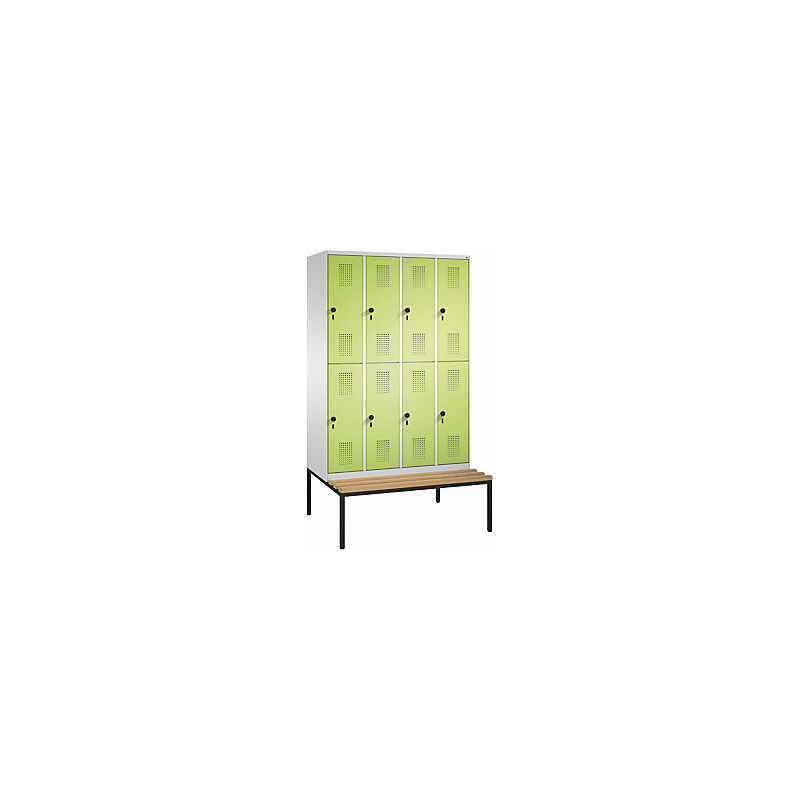 Armadietto guardaroba EVOLO, a due piani, con panca, 4 vani, 2 scomparti per vano, larghezza vani 300 mm, grigio chiaro / verdino. Fornitura = preassemblato, montaggio finale a cura del cliente. Altezza = 2090 mm. Larghezza = 1200 mm. Profondità = 815 mm. Colore corpo = grigio chiaro RAL 7035. Colore porta = verde azzurrognolo RDS 1108060. Serratura = chiavistello girevole di sicurezza per lucchetto. Numero scomparti in larghezza = 4 pz. Numero scomparti = 8 pz. Materiale = lamiera d'acciaio. Larghezza scomparti = 300 mm. Profondità scomparti = 500 mm. Dotazione interna = 1 asta appendiabiti, 3 ganci scorrevoli. Altezza sedile = 420 mm. Profondità sedile = 315 mm. Profondità armadio = 500 mm. Tipo di porta = ante piene. Colore doghe = faggio. Colore telaio = nero. Versione = con panca integrata. Serie = EVOLO. Larghezza interna = 245 mm. Altezza interna = 813 mm. Lo scomparto è dotato di una robusta asta appendiabiti a sezione ovale con 3 ganci scorrevoli antitorsione. Panca integrata