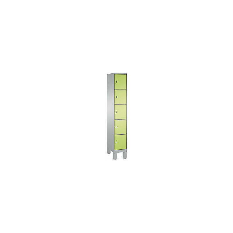 Armadio a scomparti EVOLO, con piedini, 1 vano, 5 scomparti, larghezza vano 300 mm, alluminio brillante / verdino. Fornitura = montato. Altezza = 1850 mm. Profondità = 500 mm. Larghezza = 300 mm. Colore corpo = alluminio brillante RAL 9006. Colore porta = verde azzurrognolo RDS 1108060. Serratura = serratura a cilindro differenziata. Numero scomparti in larghezza = 1 pz. Numero scomparti = 5 pz. Larghezza scomparti = 300 mm. Materiale = lamiera d'acciaio. Altezza armadietto = 1850 mm. Dotazione interna = senza dotazione interna. Larghezza interna = 298 mm. Profondità interna = 465 mm. Tipo di porta = anta a battente. Altezza piedini = 150 mm. Struttura = con saldatura. Superficie = con verniciatura a forno. Armadio a scomparti su piedini in plastica anticorrosione alti 150 mm, con regolazione altezza integrata. Ante lisce a parete singola sovrapposte, supporto su cardini con battuta a destra. 1 serratura a cilindro e 2 chiavi per anta. Viene consegnato montato.
