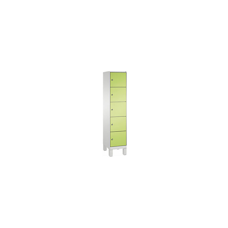 Armadio a scomparti EVOLO, con piedini, 1 vano, 5 scomparti, larghezza vano 400 mm, grigio chiaro / verdino. Fornitura = montato. Altezza = 1850 mm. Profondità = 500 mm. Larghezza = 400 mm. Colore corpo = grigio chiaro RAL 7035. Colore porta = verde azzurrognolo RDS 1108060. Serratura = serratura a cilindro differenziata. Numero scomparti in larghezza = 1 pz. Numero scomparti = 5 pz. Larghezza scomparti = 400 mm. Materiale = lamiera d'acciaio. Altezza armadietto = 1850 mm. Dotazione interna = senza dotazione interna. Profondità interna = 465 mm. Tipo di porta = anta a battente. Altezza piedini = 150 mm. Struttura = con saldatura. Superficie = con verniciatura a forno. Armadio a scomparti su piedini in plastica anticorrosione alti 150 mm, con regolazione altezza integrata. Ante lisce a parete singola sovrapposte, supporto su cardini con battuta a destra. 1 serratura a cilindro e 2 chiavi per anta. Viene consegnato montato.