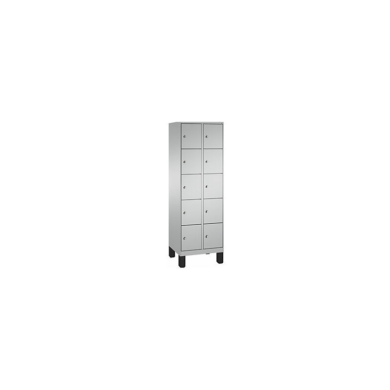 Armadio a scomparti EVOLO, con piedini, 2 vani, 5 scomparti per vano, larghezza vani 300 mm, alluminio brillante / alluminio brillante. Fornitura = montato. Altezza = 1850 mm. Profondità = 500 mm. Larghezza = 600 mm. Colore corpo = alluminio brillante RAL 9006. Colore porta = alluminio brillante RAL 9006. Serratura = serratura a cilindro differenziata. Numero scomparti in larghezza = 2 pz. Numero scomparti = 10 pz. Larghezza scomparti = 300 mm. Materiale = lamiera d'acciaio. Altezza armadietto = 1850 mm. Dotazione interna = senza dotazione interna. Profondità interna = 465 mm. Tipo di porta = anta a battente. Altezza piedini = 150 mm. Struttura = con saldatura. Superficie = con verniciatura a forno. Armadio a scomparti su piedini in plastica anticorrosione alti 150 mm, con regolazione altezza integrata. Ante lisce a parete singola sovrapposte, supporto su cardini con battuta a destra. 1 serratura a cilindro e 2 chiavi per anta. Viene consegnato montato.