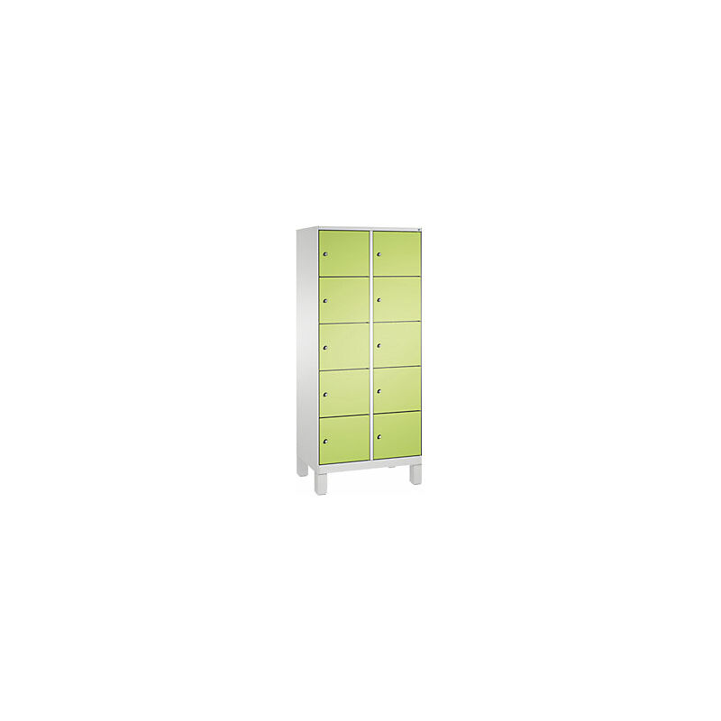 Armadio a scomparti EVOLO, con piedini, 2 vani, 5 scomparti per vano, larghezza vani 400 mm, grigio chiaro / verdino. Fornitura = montato. Altezza = 1850 mm. Profondità = 500 mm. Larghezza = 800 mm. Colore corpo = grigio chiaro RAL 7035. Colore porta = verde azzurrognolo RDS 1108060. Serratura = serratura a cilindro differenziata. Numero scomparti in larghezza = 2 pz. Numero scomparti = 10 pz. Larghezza scomparti = 400 mm. Materiale = lamiera d'acciaio. Altezza armadietto = 1850 mm. Dotazione interna = senza dotazione interna. Profondità interna = 465 mm. Tipo di porta = anta a battente. Altezza piedini = 150 mm. Struttura = con saldatura. Superficie = con verniciatura a forno. Armadio a scomparti su piedini in plastica anticorrosione alti 150 mm, con regolazione altezza integrata. Ante lisce a parete singola sovrapposte, supporto su cardini con battuta a destra. 1 serratura a cilindro e 2 chiavi per anta. Viene consegnato montato.