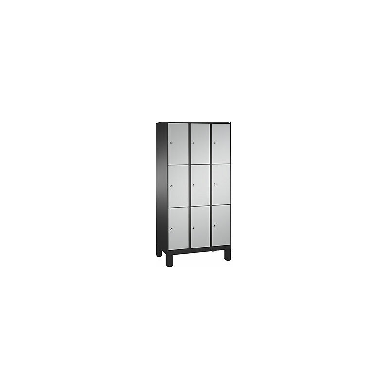 Armadio a scomparti EVOLO, con piedini, 3 vani, 3 scomparti per vano, larghezza vani 300 mm, grigio nerastro / alluminio brillante. Fornitura = montato. Altezza = 1850 mm. Profondità = 500 mm. Larghezza = 900 mm. Colore corpo = grigio nerastro RAL 7021. Colore porta = alluminio brillante RAL 9006. Serratura = serratura a cilindro differenziata. Numero scomparti in larghezza = 3 pz. Numero scomparti = 9 pz. Larghezza scomparti = 300 mm. Materiale = lamiera d'acciaio. Altezza armadietto = 1850 mm. Dotazione interna = senza dotazione interna. Profondità interna = 465 mm. Tipo di porta = anta a battente. Altezza piedini = 150 mm. Struttura = con saldatura. Superficie = con verniciatura a forno. Armadio a scomparti su piedini in plastica anticorrosione alti 150 mm, con regolazione altezza integrata. Ante lisce a parete singola sovrapposte, supporto su cardini con battuta a destra. 1 serratura a cilindro e 2 chiavi per anta. Viene consegnato montato.