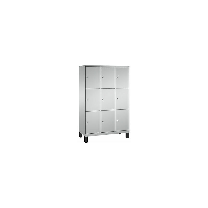 Armadio a scomparti EVOLO, con piedini, 3 vani, 3 scomparti per vano, larghezza vani 400 mm, alluminio brillante / alluminio brillante. Fornitura = montato. Altezza = 1850 mm. Profondità = 500 mm. Larghezza = 1200 mm. Colore corpo = alluminio brillante RAL 9006. Colore porta = alluminio brillante RAL 9006. Serratura = serratura a cilindro differenziata. Numero scomparti in larghezza = 3 pz. Numero scomparti = 9 pz. Larghezza scomparti = 400 mm. Materiale = lamiera d'acciaio. Altezza armadietto = 1850 mm. Dotazione interna = senza dotazione interna. Profondità interna = 465 mm. Tipo di porta = anta a battente. Altezza piedini = 150 mm. Struttura = con saldatura. Superficie = con verniciatura a forno. Armadio a scomparti su piedini in plastica anticorrosione alti 150 mm, con regolazione altezza integrata. Ante lisce a parete singola sovrapposte, supporto su cardini con battuta a destra. 1 serratura a cilindro e 2 chiavi per anta. Viene consegnato montato.