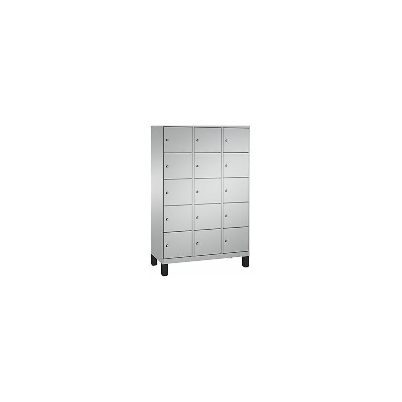 Armadio a scomparti EVOLO, con piedini, 3 vani, 5 scomparti per vano, larghezza vani 400 mm, alluminio brillante / alluminio brillante. Fornitura = montato. Altezza = 1850 mm. Profondità = 500 mm. Larghezza = 1200 mm. Colore corpo = alluminio brillante RAL 9006. Colore porta = alluminio brillante RAL 9006. Serratura = serratura a cilindro differenziata. Numero scomparti in larghezza = 3 pz. Numero scomparti = 15 pz. Larghezza scomparti = 400 mm. Materiale = lamiera d'acciaio. Altezza armadietto = 1850 mm. Dotazione interna = senza dotazione interna. Profondità interna = 465 mm. Tipo di porta = anta a battente. Altezza piedini = 150 mm. Struttura = con saldatura. Superficie = con verniciatura a forno. Armadio a scomparti su piedini in plastica anticorrosione alti 150 mm, con regolazione altezza integrata. Ante lisce a parete singola sovrapposte, supporto su cardini con battuta a destra. 1 serratura a cilindro e 2 chiavi per anta. Viene consegnato montato.