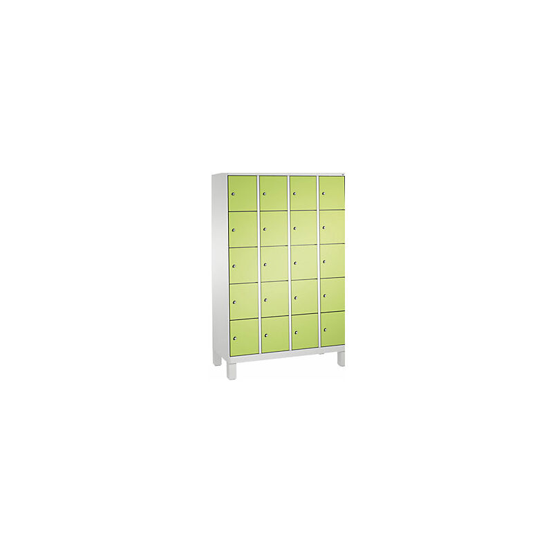 Armadio a scomparti EVOLO, con piedini, 4 vani, 5 scomparti per vano, larghezza vani 300 mm, grigio chiaro / verdino. Fornitura = montato. Altezza = 1850 mm. Profondità = 500 mm. Larghezza = 1200 mm. Colore corpo = grigio chiaro RAL 7035. Colore porta = verde azzurrognolo RDS 1108060. Serratura = serratura a cilindro differenziata. Numero scomparti in larghezza = 4 pz. Numero scomparti = 20 pz. Larghezza scomparti = 300 mm. Materiale = lamiera d'acciaio. Altezza armadietto = 1850 mm. Dotazione interna = senza dotazione interna. Profondità interna = 465 mm. Tipo di porta = anta a battente. Altezza piedini = 150 mm. Struttura = con saldatura. Superficie = con verniciatura a forno. Armadio a scomparti su piedini in plastica anticorrosione alti 150 mm, con regolazione altezza integrata. Ante lisce a parete singola sovrapposte, supporto su cardini con battuta a destra. 1 serratura a cilindro e 2 chiavi per anta. Viene consegnato montato.