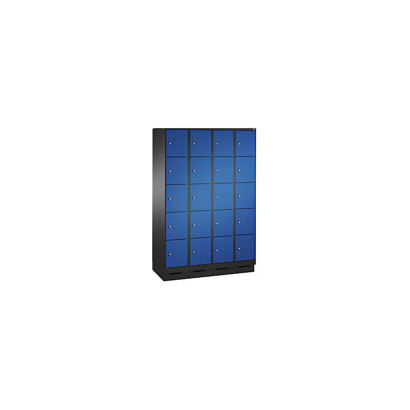 Armadio a scomparti EVOLO, con zoccolino, 4 vani, 5 scomparti per vano, larghezza vani 300 mm, grigio nerastro / blu genziana. Fornitura = montato. Altezza = 1800 mm. Profondità = 500 mm. Larghezza = 1200 mm. Colore corpo = grigio nerastro RAL 7021. Colore porta = blu genziana RAL 5010. Serratura = serratura a cilindro differenziata. Numero scomparti in larghezza = 4 pz. Numero scomparti = 20 pz. Materiale = lamiera d'acciaio. Altezza armadietto = 1800 mm. Dotazione interna = senza dotazione interna. Larghezza interna = 245 mm. Altezza interna = 295 mm. Profondità interna = 465 mm. Tipo di porta = anta a battente. Altezza zoccolo = 100 mm. Struttura = con saldatura. Superficie = con verniciatura a forno. Armadio a scomparti su zoccolino alto 100 mm, arretrato anteriormente con apertura per una ventilazione ottimale. Ante lisce a parete singola sovrapposte, supporto su cardini con battuta a destra. 1 serratura a cilindro e 2 chiavi per anta. Viene consegnato montato.