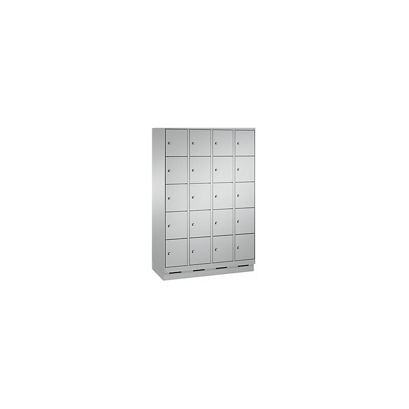 Armadio a scomparti EVOLO, con zoccolino, 4 vani, 5 scomparti per vano, larghezza vani 300 mm, alluminio brillante / alluminio brillante. Fornitura = montato. Altezza = 1800 mm. Profondità = 500 mm. Larghezza = 1200 mm. Colore corpo = alluminio brillante RAL 9006. Colore porta = alluminio brillante RAL 9006. Serratura = serratura a cilindro differenziata. Numero scomparti in larghezza = 4 pz. Numero scomparti = 20 pz. Materiale = lamiera d'acciaio. Altezza armadietto = 1800 mm. Dotazione interna = senza dotazione interna. Larghezza interna = 245 mm. Altezza interna = 295 mm. Profondità interna = 465 mm. Tipo di porta = anta a battente. Altezza zoccolo = 100 mm. Struttura = con saldatura. Superficie = con verniciatura a forno. Armadio a scomparti su zoccolino alto 100 mm, arretrato anteriormente con apertura per una ventilazione ottimale. Ante lisce a parete singola sovrapposte, supporto su cardini con battuta a destra. 1 serratura a cilindro e 2 chiavi per anta. Viene consegnato