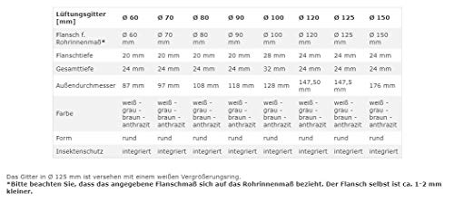 MKK 17969 - Griglia di aerazione per esterni con zanzariera, 60 70 80 90 100 120 125 150 mm, colore: Bianco/Grigio/Marrone, Grau, Ø 90 mm