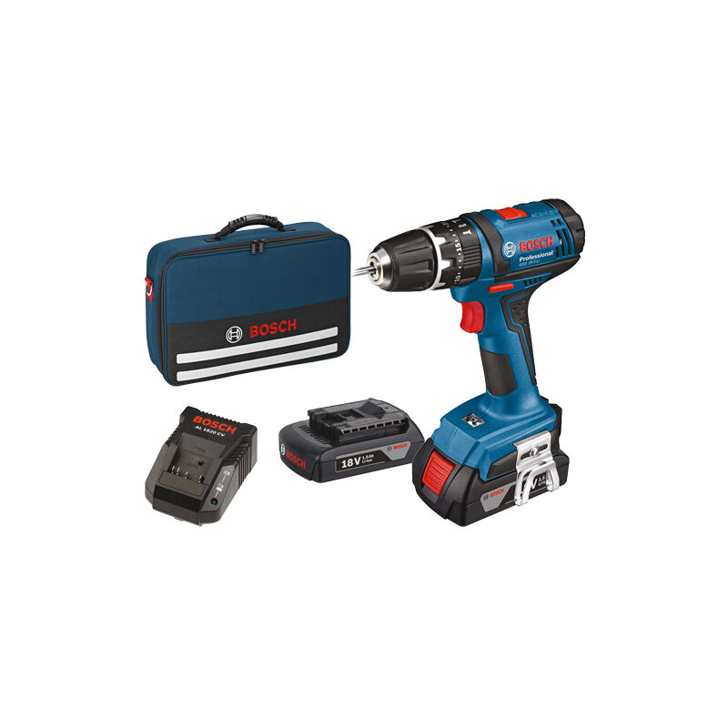 Trapani-Avvitatori con percussione. Potenza 18 Volt - 1,5Ah, batteria Litio, velocità 0-500/1900 giri/min., mandrino 10 mm., coppia di serraggio max 63 Nm, posizioni regolazioni di coppia 20+1 per la foratura. Dotazione 2 batterie, caricabatterie, Soft bag