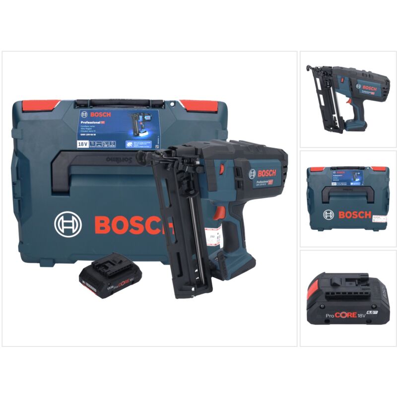 Contenuto della consegna: - 1x Chiodatrice a batteria Bosch GNH 18V-64 M - 1x batteria Bosch GBA 18 V 4,0 Ah ProCORE ( 1600A016GB ) - 1x L-BOXX - senza caricabatterie Descrizione del prodotto: La GNH 18V-64 M Bosch Professional è una potente chiodatrice a testa rovesciata di alta qualità per un fissaggio rapido e preciso. Con una tensione della batteria di 18 V, un angolo di caricamento di 20, una lunghezza del chiodo di 1,6 mm e una dimensione del chiodo da 32 a 64 mm, è adatta a molte applicazioni diverse. Il colpo singolo e il colpo a contatto facilitano il tiro e aumentano la precisione. Il blocco del tiro a secco quando il caricatore dei chiodi è vuoto garantisce una maggiore protezione del legno. Il GNH 18V-64 M è leggero, pesa solo 2,9 kg e non necessita di tubo dell'aria, compressore o cartuccia di gas. Con un valore di emissione di vibrazioni di 2,5 m/s e un livello di potenza sonora di 95 dB(A), il GNH 18V-64 M è una soluzione comoda ed efficiente per i lavori di fissaggio
