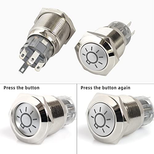 [Introduzione al prodotto] Interruttore a pulsante in metallo autobloccante con icona a lampadina, con spina precablata. Dimensioni del foro di montaggio: 0,75"/19mm