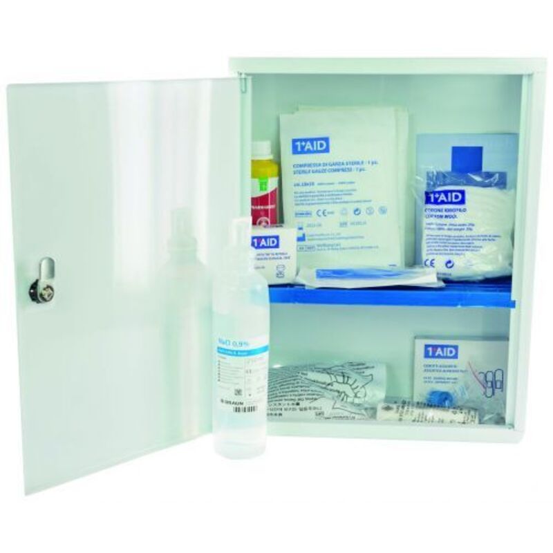 Struttura in metallo verniciato, serratura con chiave, bordi arrotondati, ripiano centrale per un migliore alloggiamento dei contenuti, fori posteriori per l'attacco a parete, colore bianco. Contenuto conforme al D.Lgs n. 81/2008 (gruppo C - allegato 2). Per aziende con meno di 3 lavoratori.