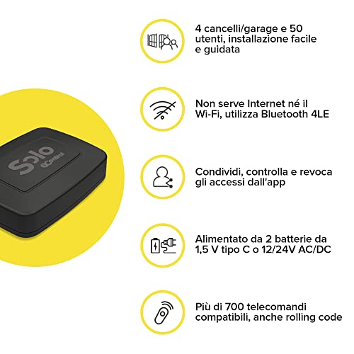 CONTENUTO - A casa riceverai 1 apri cancello SOLO EVO, l'unico al mondo brevettato e senza fili da collegare, basterà solo copiare il tuo telecomando. il prodotto ideale per chi vuole aprire cancello o garage con semplicità e rapidità da smartphone e Smartwatch (Apple e Android WearOs). È alimentato da batterie, già incluse nella confezione, che hanno una durata di più di 2 anni con 10 aperture giornaliere. C'è anche la possibilità di scegliere e utilizzare l'ingresso a 12/24V AC/DC