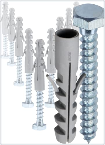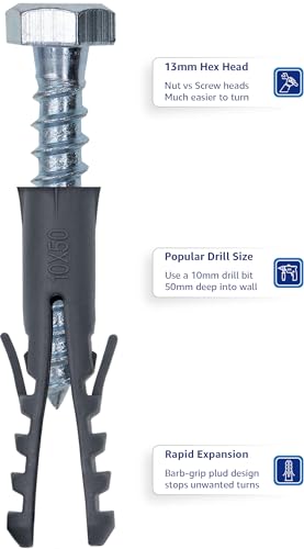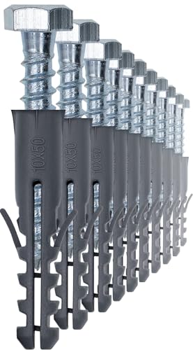 1STec 10 x M10 x 50 mm forte ancoraggio satellitare in nylon zincato Mungo spina da parete + vite per coach resistente con testa esagonale da 13 mm per il fissaggio di antenne e cielo