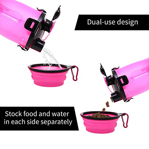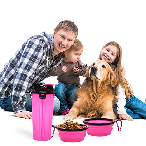 2-in-1 Cane Bottiglia d'acqua Distributore di cibo con 2 pieghevole Ciotole per cani, prova di perdita Mangiatoia per cani, Gatto e cucciolo All'aperto Viaggio Camminare escursione Campo, Rosa