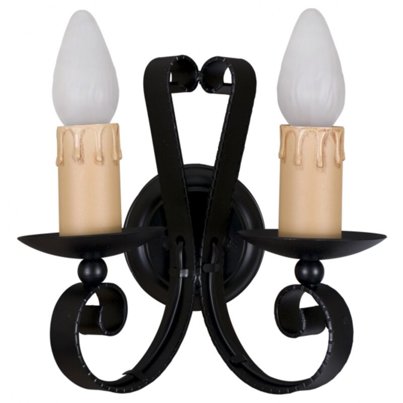 Applicare serie medievale di due luci. Realizzato in metallo nero, con due portalampada E27. Può essere abbinato a un unico corpo illuminante e lampade a tre, cinque, otto, dieci e dodici luci. Le sue misure sono 25x24x16 cm.