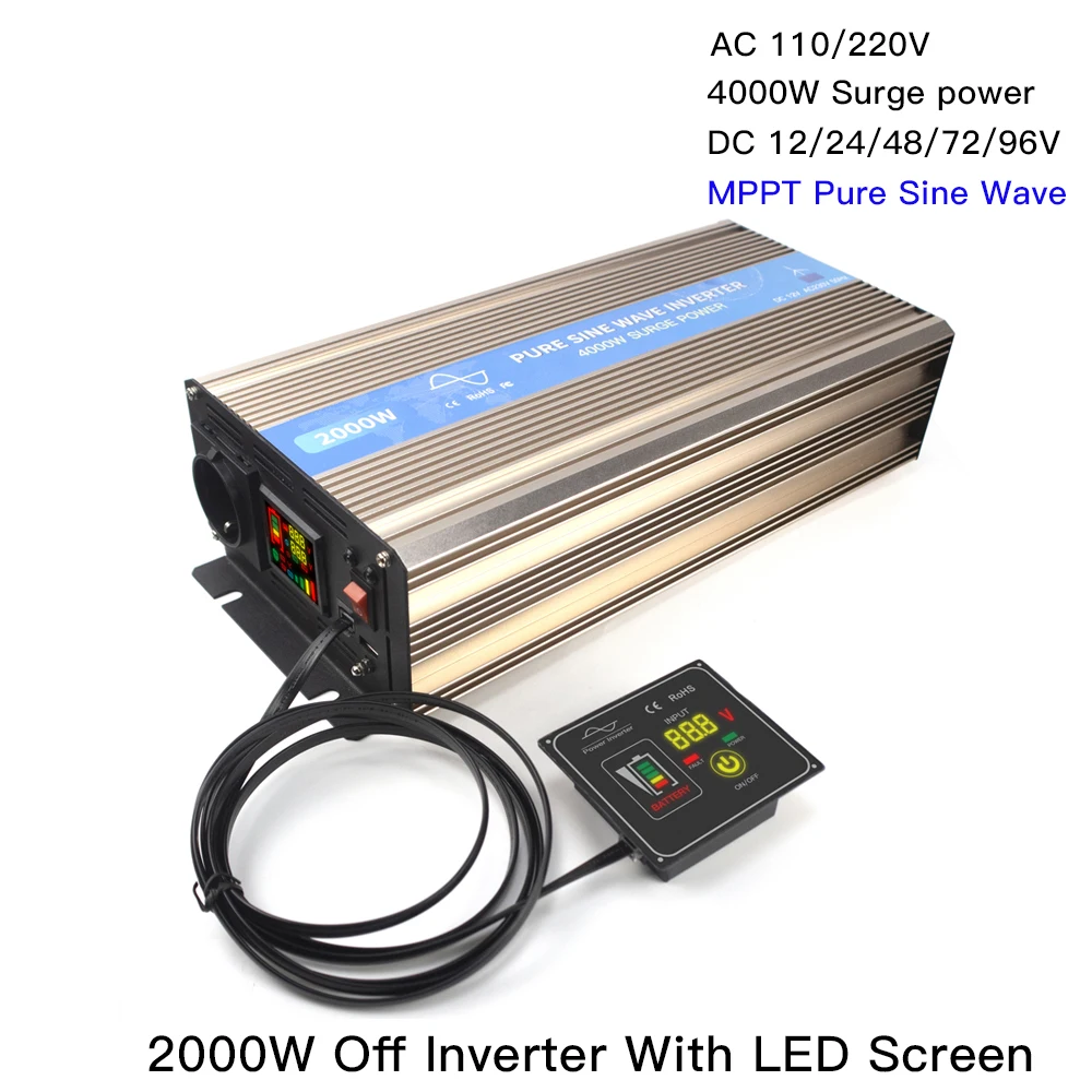 2000W MPPT Off Pure Sine Wave Inverter Solar Wind Power Hybrid Inversor 12/24/48V/72/96V With LED Screen Switch for 110V 220V