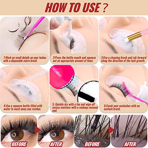 Facile da Usare: In primo luogo bagnare le ciglia, premere una pompa dello shampoo per occhio, quindi muoversi in un movimento circolare con il pennello shampoo, la schiuma detergente ricca può rimuovere in profondità impurità e oli e quindi utilizzare la bottiglia di spremitura riempita con acqua per risciacquare le ciglia, utilizzare i cuscinetti riutilizzabili strofinare le ciglia e soffiare le ciglia con un ventilatore per ciglia, infine spazzolare le ciglia con il pennello per ciglia.