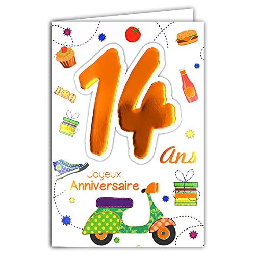 Age MV 69 - 2014 scheda di buon compleanno 14 anni adolescenti ragazzo ragazza, motivo scooter Vespa regali torta Cupcake Hamburger Basket