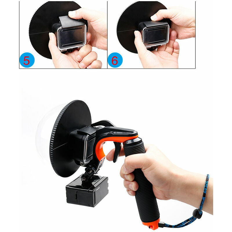 acqua. Con un obiettivo grandangolare, puoi scattare foto straordinarie . Design impermeabile per assicurarti di scattare foto o video belli e di alta qualità in acqua. Dotato di una nuova impugnatura antiscivolo, ideale per l'uso sott'acqua. Viene fornito con una custodia protettiva per evitare graffi sulla cupola.