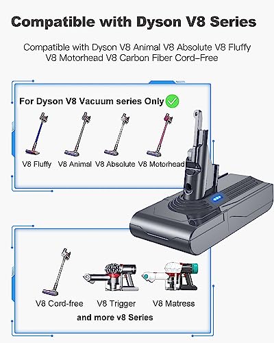 【2023 Nuova Batteria di Aggiornamento per Dyson V8】Batteria di ricambio per Dyson V8. Capacità: 6000mAh. Tipo: Li-Ion, Tensione: 21,6V. Batteria agli ioni di litio di alta qualità, ideale per gli aspirapolvere Dyson V8. Nessun effetto memoria, durata superiore alle originali.