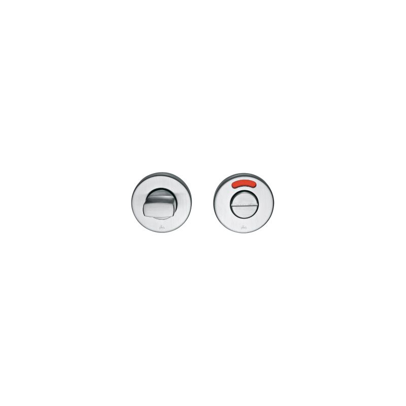 Dimensions mm (Inch): round rosette Ø50 (1-31/32), thickness 8 (5/16), handle side projection 32 (1-1/4), side projection � signal 12 (15/16). Ergonomically shaped handle Ø22 (55/64) External signaling device in stainless steel with recess for emergency opening and with window with availability indicator (red-green). 6 x 6 (1/4x1/4) transmission panel for European WC type lock. Fixing kit with hidden self-tapping screws. Satin finish.