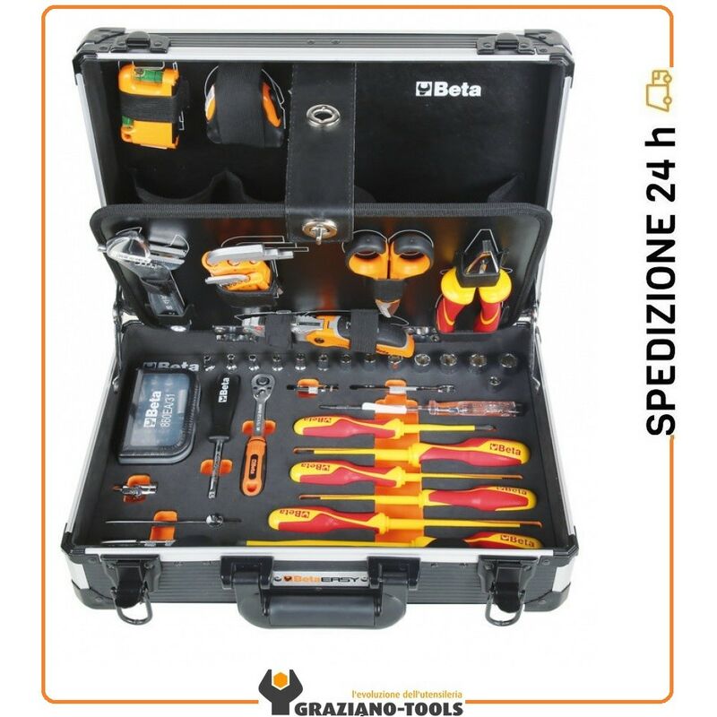 Descrizione: La valigetta con assortimento per elettricisti 74 Pz. Beta 2054BM-74 è una pratica soluzione della linea Beta Easy, completa di accessori ed utensili manuali per il professionista nell'ambito elettrico. Questa valigetta, solida e robusta, è realizzata in polipropilene con profili in alluminio e presenta piedini per un appoggio stabile e maniglia con impugnatura morbida per un facile trasporto. L'interno offre spazio per un'ampia dotazione di utensili manuali, grazie a tre ampie tasche per riporre i propri strumenti, sagomature per gli utensili e modulo termoformato in spugna grazie ai quali sarà estremamente semplice ed immediato riconoscere l'utensile da utilizzare e riporlo nella maniera più ordinata possibile al termine del lavoro. Il Beta 2054BM-74 è un assortimento promozionale, adatto sia per utilizzi professionali che per hobbisti, perfetto per completare la propria dotazione di utensili manuali con accessori di qualità specificatamente ideati per l'ambito