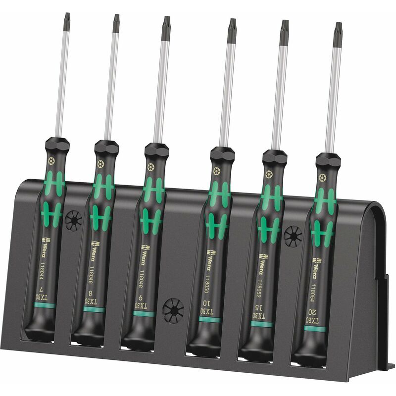 Kit di giraviti Micro di alta qualità della Wera per avvitamenti nella meccanica di precisione. Per avvitamenti antimanomissione TORX: le viti BO hanno un perno di sicurezza sporgente. In questo modo si evita un allentamento non autorizzato, poiché non è possibile avvitare o allentare queste viti con dei normali utensili ad esagono cavo. Solo gli utensili speciali TORX BO dispongono di un foro nel quale può rientrare il perno. Appoggiando la mano sul cappuccio girevole, grazie alla zona di rotazione rapida al di sotto del cappuccio, è possibile effettuare delle rotazioni ultrarapide. Si risparmia così tempo per cambiare presa. Nella zona di forza sono state integrate zone morbide per poter trasmettere forze elevate di serraggio e di allentamento. Zona di precisione per trovare sempre l'angolo giusto di rotazione durante i lavori di aggiustaggio. La punta Black Point della Wera garantisce una maggiore protezione contro la corrosione e un accoppiamento preciso.