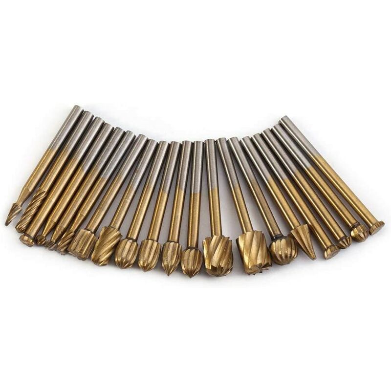 Realizzata in materiale di acciaio ad alta velocità, trattamento di rivestimento in titanio, elevata durezza, elevata resistenza all'abrasione e elevata resistenza al calore 20 pezzi di diverse forme e dimensioni, la testa di taglio n' è facile da aggrovigliare, utensile per spellare Il gambo tondo da 1/8'' si adatta a molti utensili elettrici e pneumatici e macchine utensili Molatura ad alta velocità dei denti super ruvidi, adatta per legno, plastica e altri materiali morbidi Viene utilizzato per tagliare, sagomare e rimuovere spigoli vivi o spigoli, bave e materiale in eccesso