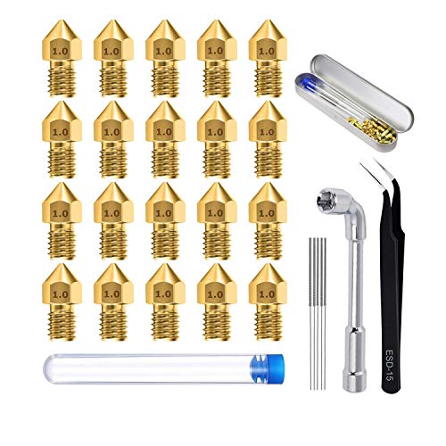 20pcs 1 mm 3D Ugello dell'Estrusore della Stampante 3D MK8, con 5pcs Ago Pulizia(0.8 mm)+ 1 Chiave + 1 Pinzetta Gomito, Per MK8 Makerbot/Creality CR-10 / Ender 3/5