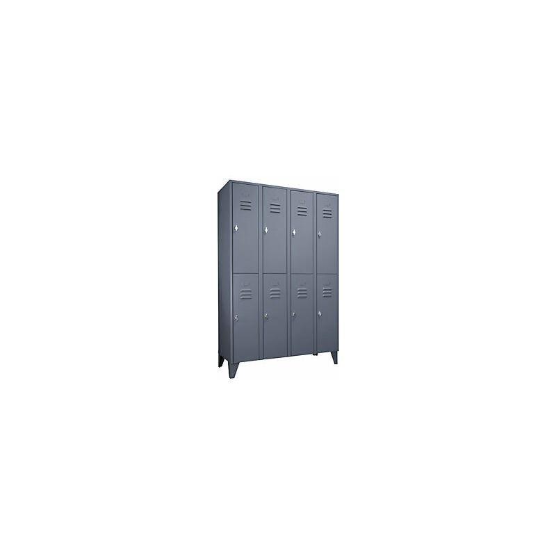 Armadietto in acciaio con piedini, scomparti a metà altezza, ante piene, larghezza scomparti 300 mm, 8 scomparti, grigio-azzurro. Fornitura = montato. Altezza = 1850 mm. Profondità = 500 mm. Larghezza = 1200 mm. Colore corpo = grigioazzurro RAL 7031. Colore porta = grigioazzurro RAL 7031. Serratura = chiavistello girevole. Numero scomparti in larghezza = 4 pz. Numero scomparti = 8 pz. Larghezza scomparti = 300 mm. Materiale = lamiera d'acciaio. Altezza armadietto = 1850 mm. Dotazione interna = 1 asta appendiabiti, 3 ganci scorrevoli. Larghezza interna = 298 mm. Altezza interna = 820 mm. Profondità interna = 475 mm. Tipo di porta = ante piene. Altezza scomparti = 820 mm. Larghezza ripiani = 300 mm. Profondità ripiani = 500 mm. Altezza piedini = 150 mm. Struttura = saldata a punti. Superficie = con verniciatura a forno. Robusto armadietto con piedini a norma DIN 4547. Spazio ottimizzato grazie agli scomparti a mezza altezza. Disponibili in varie larghezze e colori. A scelta con ante
