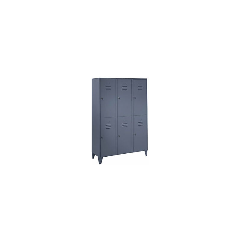 Armadietto in acciaio con piedini, scomparti a metà altezza, ante piene, larghezza scomparti 400 mm, 6 scomparti, grigio-azzurro. Fornitura = montato. Altezza = 1850 mm. Profondità = 500 mm. Larghezza = 1200 mm. Colore corpo = grigioazzurro RAL 7031. Colore porta = grigioazzurro RAL 7031. Serratura = chiavistello girevole. Numero scomparti in larghezza = 3 pz. Numero scomparti = 6 pz. Larghezza scomparti = 400 mm. Materiale = lamiera d'acciaio. Altezza armadietto = 1850 mm. Dotazione interna = 1 asta appendiabiti, 4 ganci scorrevoli. Larghezza interna = 398 mm. Altezza interna = 820 mm. Profondità interna = 475 mm. Tipo di porta = ante piene. Altezza scomparti = 820 mm. Larghezza ripiani = 400 mm. Profondità ripiani = 500 mm. Altezza piedini = 150 mm. Struttura = saldata a punti. Superficie = con verniciatura a forno. Robusto armadietto con piedini a norma DIN 4547. Spazio ottimizzato grazie agli scomparti a mezza altezza. Disponibili in varie larghezze e colori. A scelta con ante