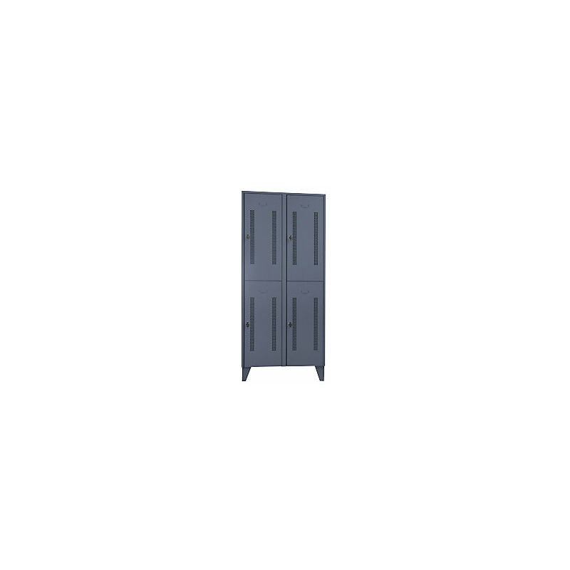 Armadietto in acciaio con piedini, scomparti a metà altezza, ante forate, larghezza scomparti 400 mm, 4 scomparti, grigio-azzurro. Fornitura = montato. Altezza = 1850 mm. Profondità = 500 mm. Larghezza = 800 mm. Colore corpo = grigioazzurro RAL 7031. Colore porta = grigioazzurro RAL 7031. Serratura = chiavistello girevole. Numero scomparti in larghezza = 2 pz. Numero scomparti = 4 pz. Larghezza scomparti = 400 mm. Materiale = lamiera d'acciaio. Altezza armadietto = 1850 mm. Dotazione interna = 1 asta appendiabiti, 4 ganci scorrevoli. Larghezza interna = 398 mm. Altezza interna = 820 mm. Profondità interna = 475 mm. Tipo di porta = ante forate. Altezza scomparti = 820 mm. Larghezza ripiani = 400 mm. Profondità ripiani = 500 mm. Altezza piedini = 150 mm. Struttura = saldata a punti. Superficie = con verniciatura a forno. Robusto armadietto con piedini a norma DIN 4547. Spazio ottimizzato grazie agli scomparti a mezza altezza. Disponibili in varie larghezze e colori. A scelta con ante