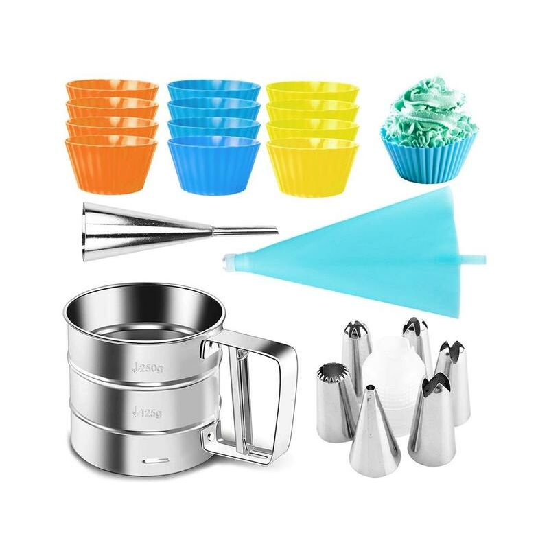 Colore: MulticolorMateriale: acciaio Inox, plastica, siliconeSingolo Formato:Farina setaccio: L * H: 15.5*9.5 centimetri (6.1 * 3.74in)Torta cupcake: D * H: 6.8*3.1 centimetri (2.68 * 1.22in)Cucina imbuto: W * H: 2.5*9cm(0.98 * 3.54in)Ogni piping suggerimento: W * H: 1.8*3 centimetri (0.70 * 1.18in)Sacchetto della pasticceria: W * H: 17.5*30cm(6.88 * 11.80in)Di plastica accoppiatore: D * H: 2.5*3.3 centimetri (0.98 * 1.29in)Cornici E Articoli Da Esposizione Comprende:6 x Piping tips(6 tipi)1 x sacchetto Della Pasticceria1 x Plastica accoppiatore12 x Torta del bigné (3 colori)1 x Farina setaccio1 x Cucina imbutoNota:-Cornici E Articoli Da Esposizione comprende 22 pezzi di cottura della torta di accessori.-Il cibo non è incluso.-Si prega di fare riferimento alla misura di. Piccolo errore di misura è consentita in range di normalità.-Ci potrebbe essere una poca differenza di colore a causa del monitor, macchina fotografica o di altri fattori, si prega di fare riferimento alla voce